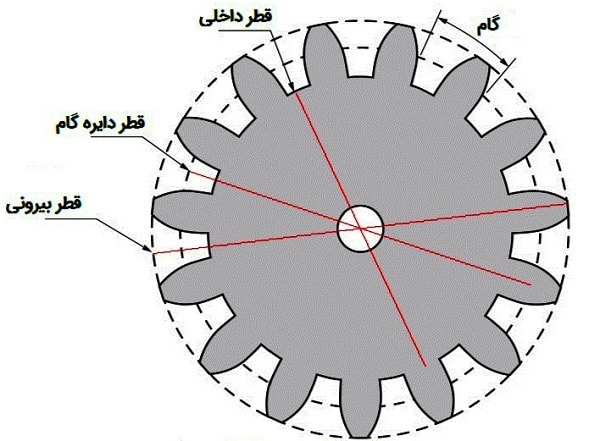 دایره گام: هنگامی که دو چرخ دنده مشبک می شوند، دو دایره خیالی وجود دارد که بر یکدیگر مماس هستند. به این دو دایره Pitch Circle و به قطر آنها Pitch Diameter نیز می گویند. برای بدست آوردن گام، محیط دایره گام را بر تعداد دندانه ها تقسیم می کنیم.