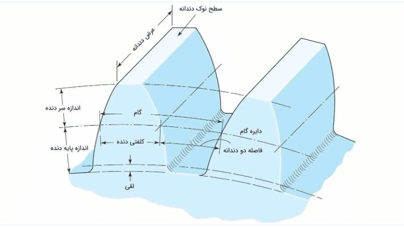 تصویر زیر یک چرخ دنده ساده را از نزدیک نشان می دهد. پارامترهای اصلی چرخ دنده را در شکل مشاهده می کنید. در ادامه به تعریف برخی از این پارامترها می پردازیم.