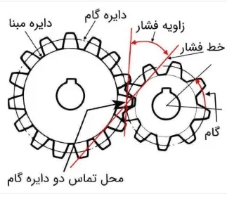 خط فشار: خطی که بر هر دو دایره پایه مماس باشد، خط فشار نامیده می شود. زاویه بین خط فشار و خط تماس دایره های گام را زاویه فشار می گویند. در طرح ها معمولا زاویه فشار 14.514.5، 2020 و 2525 درجه در نظر گرفته می شود.
