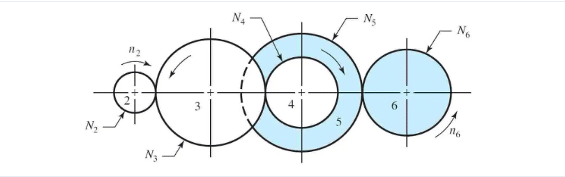 در رابطه فوق، nn نشان دهنده سرعت بر حسب دور در دقیقه، NN تعداد دندانه ها و dd نشان دهنده قطر دایره گام است. این رابطه برای انواع چرخ دنده ها (ساده، مارپیچ، اریب و مارپیچ) قابل استفاده است. در طرح ها پیشنهاد شده است که نسبت تبدیل سرعت در دو دنده مجاور از 10:110:1 بیشتر نباشد. با این حال، در شرایط عادی، از یک دنده ساده برای نسبت های سرعت 1:11:1 تا 6:16:1 استفاده می شود. برای به دست آوردن سرعت دنده های بعدی نیز می توان از همین روش استفاده کرد. به عنوان مثال در شکل قبل سرعت دنده شماره 6 به صورت زیر بدست آمده است.